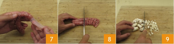 Entfernen Sie die Haut von der Wurst 7 und zerkleinern Sie das Fleisch zu einer feinen Mischung 8. Hacken Sie auch die beiseitegelegten Pilzstiele 9.