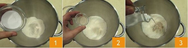 Um die Mohn-, Mandel- und Marzipanrolle herzustellen, beginnen Sie mit dem Teig: In die Schüssel einer Küchenmaschine mit Flachrührer geben Sie das gesiebte Mehl, den Kristallzucker 1, die Trockenhefe 2. Gießen Sie die Milch nach und nach dazu 3,