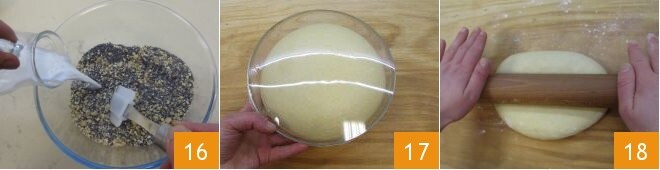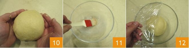 Fahren Sie fort, bis der Teig am Knethaken hängt, legen Sie ihn dann auf eine Arbeitsfläche und formen Sie ihn zu einer Kugel 10, fetten Sie eine Schüssel ein 11, legen Sie die Teigkugel hinein, bedecken Sie sie mit Frischhaltefolie 12 und lassen Sie sie im ausgeschalteten Ofen mit eingeschaltetem Licht etwa 4 Stunden gehen, oder bis der Teig sein Volumen verdreifacht hat.