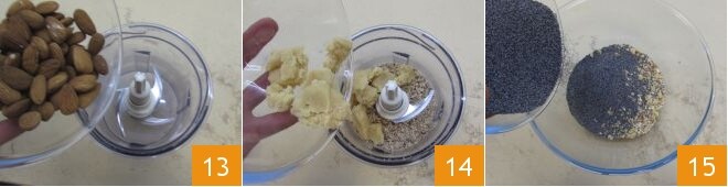 In der Zwischenzeit geben Sie in die Schüssel eines Mixers die Mandeln 13, das in Stücke geschnittene Marzipan 14, pürieren Sie alles zusammen und geben Sie die Mischung dann in eine Schüssel, fügen Sie den Mohn hinzu 15,