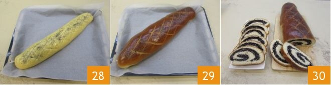 schneiden Sie die Oberfläche mit einem glatten Messer mit gekreuzten Diagonalen ein, um ein Rautenmuster zu erzeugen 28, bestreuen Sie mit Mohn 29 und backen Sie im vorgeheizten statischen Ofen bei 170° für 30 Minuten (oder im Umluftofen bei 150° für 20 Minuten). Nach dem Backen nehmen Sie die Mohn-, Mandel- und Marzipanrolle aus dem Ofen, lassen Sie sie abkühlen und servieren Sie sie dann in Scheiben 30.