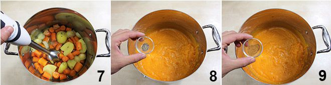 Wenn das Gemüse gar ist, entfernen Sie das Kräuterbündel und pürieren es mit dem Stabmixer (oder Mixer) 7, bis die Suppe eine cremige Konsistenz hat. Mit Salz und Pfeffer abschmecken 8 und den Zimt hinzufügen 9.