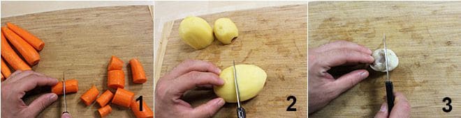 Um die Möhrencremesuppe mit Zimt zuzubereiten, waschen, schälen und schneiden Sie die Karotten 1, die Kartoffeln 2 und die vier Schalotten 3 in Stücke.
