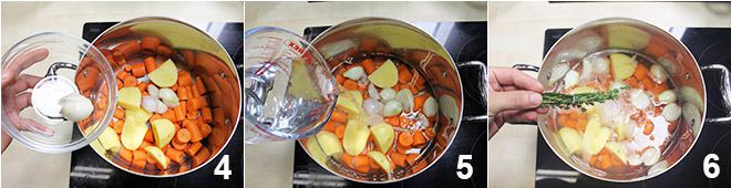 Geben Sie nun das Gemüse in einen großen Topf 4 und fügen Sie 1 Liter Wasser hinzu 5, dann lassen Sie alles bei niedriger Hitze etwa eine halbe Stunde köcheln. Bereiten Sie in der Zwischenzeit das Bündel aus Lorbeer und Thymian vor, indem Sie die Zweige mit Küchengarn zusammenbinden, und geben Sie es in den Topf 6.