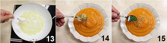 fügen Sie den Zucker hinzu 13 und kochen Sie, bis die Schalotten leicht karamellisiert sind. Stellen Sie nun die Möhrencremesuppe mit Zimt wieder auf den Herd, bei niedriger Hitze; fügen Sie 20 g Butter hinzu und rühren Sie, bis sie vollständig geschmolzen ist, dann schalten Sie den Herd aus und geben Sie die Suppe auf die Teller. Garnieren Sie sie schließlich mit den karamellisierten Schalotten 14 und gehacktem Schnittlauch 15. Die Möhrencremesuppe mit Zimt ist fertig: Servieren und genießen Sie sie noch warm.