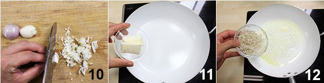 Schneiden Sie die restlichen beiden Schalotten fein und 10 lassen Sie 20 g Butter in einer antihaftbeschichteten Pfanne schmelzen 11. Braten Sie die gehackten Schalotten für wenige Minuten in der Butter an 12,