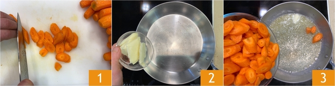 Um die Karotten in Butter und Joghurt mit geräuchertem Curry zuzubereiten, zuerst die Karotten putzen, schälen und schräg in etwa 0,5 cm dicke Scheiben schneiden 1; Sie sollten etwa 750 g geschälte Karotten erhalten. In einer großen Pfanne die Butter schmelzen 2, dann die Karotten hinzufügen 3.