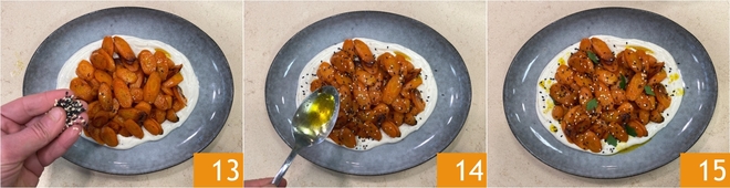 Gut verrühren, bis alles verbunden ist 10. Die Joghurtsauce auf dem Boden der Servierplatte verteilen 11, dann die Karotten darauf geben 12.
