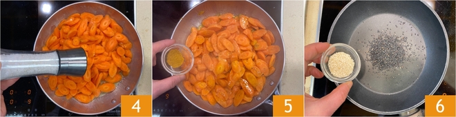 Salzen 4, pfeffern und mit dem geräucherten Curry würzen 5. Bei mittelhoher Hitze 10–15 Minuten garen, dabei häufig umrühren. Inzwischen die weißen und schwarzen Sesamsamen in einer beschichteten Pfanne etwa 3 Minuten rösten 6.