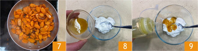Wenn die Karotten gar sind 7, kümmern Sie sich um die Joghurtsauce: Joghurt und Honig in eine kleine Schüssel geben 8, dann mit Öl 9, Salz und Pfeffer abschmecken.