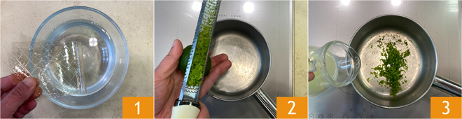 Um die Mojito-Mousse zuzubereiten, weichen Sie als erstes die Gelatine in Blättern ein 1. Reiben Sie unterdessen die Limettenschale in einen kleinen Topf 2 und fügen Sie auch den Limettensaft hinzu 3.