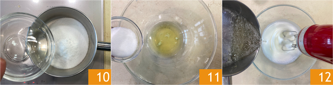 In der Zwischenzeit bereiten Sie die italienische Meringue vor, beginnend mit dem Sirup: Geben Sie 150 g Zucker und das Wasser 10 in einen kleinen Topf. Erhitzen Sie es und lassen Sie den Zucker schmelzen, wobei Sie darauf achten, die Temperatur mit einem Thermometer zu überwachen; es sollte auf 121°C kommen. In der Zwischenzeit geben Sie in eine Schüssel die Eiweiße und die restlichen 40 g Zucker 11, dann beginnen Sie mit dem Schlagen. Wenn der Sirup die richtige Temperatur erreicht hat, gießen Sie ihn in einem dünnen Strahl in die Eiweiße 12, während Sie bei niedriger Geschwindigkeit weiterschlagen, bis die Mischung abgekühlt ist.