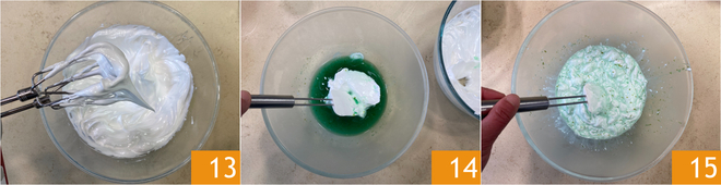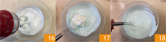 Die italienische Meringue ist fertig, wenn sie glänzend ist und beim Abziehen der Schneebesen eine Spitze bildet 13, der sogenannte „Bergspitz“. Fügen Sie die Meringue der Minzmischung hinzu 14 und mischen Sie mit einem Schneebesen, um sie zu integrieren 15. Lassen Sie es im Kühlschrank etwa 10-15 Minuten ruhen, damit es fest wird, aber nicht geliert.