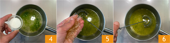 Fügen Sie den Zucker hinzu 4 und erhitzen Sie es ein paar Minuten lang, während Sie umrühren. An diesem Punkt die gut ausgedrückte Gelatine hinzufügen 5 und vollständig auflösen lassen 6.