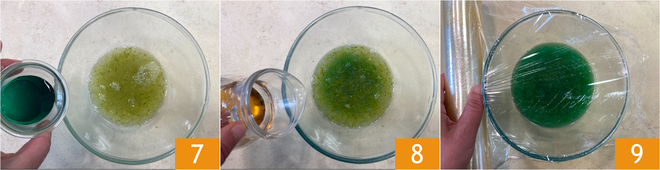 Geben Sie alles in eine Schüssel, dann fügen Sie den Minzsirup 7 und den Rum 8 hinzu und mischen Sie es. Mit Frischhaltefolie abdecken 9 und bei Raumtemperatur abkühlen lassen.