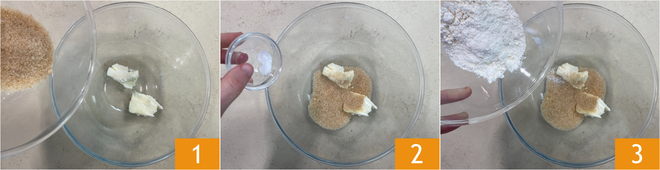 Um den Mon Chou der Pastiera vorzubereiten, beginnen Sie mit dem Craquelin: Nehmen Sie zuerst die Butter etwa 30 Minuten vor Beginn der Zubereitung aus dem Kühlschrank, damit sie weich und streichfähig ist. In einer Schüssel die plastische Butter, den braunen Zucker 1, das Salz 2 und das Mehl 3 vermischen.