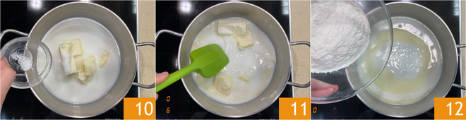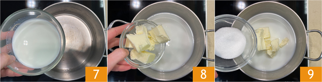 In der Zwischenzeit den Brandteig vorbereiten: Wasser und Milch in einen Topf gießen 7, dann die Butter 8 und den Zucker hinzufügen 9.