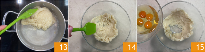 Wenn sich die Masse von den Rändern löst und einen weißen Film auf dem Boden bildet, weiter rühren für ein paar Minuten 13, dann in eine kalte Schüssel umfüllen und ausbreiten, damit sie schneller abkühlen kann 14. Nun ein Ei nach dem anderen hinzufügen 15, dabei gründlich rühren, um es in die Masse zu integrieren, bevor das nächste hinzugefügt wird.