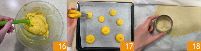 Wenn Sie eine glatte und elastische Masse erhalten haben 16, füllen Sie diese in einen Spritzbeutel mit einer 20 mm glatten Tülle. Ein Backblech mit Backpapier auslegen und mit einem Bleistift 10 Kreise mit einem Durchmesser von 5 cm und weitere 10 mit einem Durchmesser von 2 cm zeichnen, dann entlang der Konturen spritzen, um Teighaufen in diesen Größen zu erzeugen 17; so wird es einfacher, runde und präzise Windbeutel zu erhalten. Die Craquelin-Masse aus dem Gefrierschrank holen und ebenso viele Kreise in den gleichen Größen ausstechen, dazu jeweils einen Ausstecher mit einem Durchmesser von 5 cm und einen von 2 cm verwenden 18.