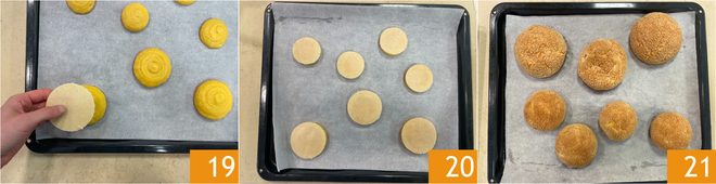 Die Craquelin-Kreise vorsichtig auf die Windbeutel der entsprechenden Größe legen 19. Im vorgeheizten Ofen bei 210°C für 15 Minuten backen, dann die Temperatur auf 180°C reduzieren und für weitere 15-20 Minuten backen. Nach dem Backen aus dem Ofen nehmen und abkühlen lassen 21.