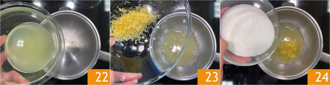 Nun die Lemon-Curd-Füllung zubereiten: In einem Topf für das Wasserbad den Zitronensaft 22 und die geriebene Zitronenschale 23 gießen, dann den Zucker hinzufügen 24.