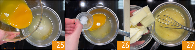 Auch die Eigelbe 25 und das Salz 26 hinzufügen. Die Hitze auf mittlere Stufe stellen und unter ständigem Rühren mit einem Schneebesen eindicken lassen. Wenn die Masse die Konsistenz einer Puddingcreme erreicht hat, die Hitze abstellen und die Butter hinzufügen 27.