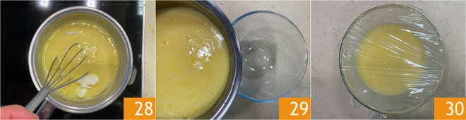 Gut umrühren, um die Butter gleichmäßig zu schmelzen 28. Den Lemon Curd in eine Schüssel gießen 29, mit Frischhaltefolie direkt auf der Oberfläche abdecken und zuerst bei Raumtemperatur, dann im Kühlschrank abkühlen lassen 30. Anschließend den Lemon Curd in einen Spritzbeutel mit einer Tülle von weniger als 1 cm füllen.