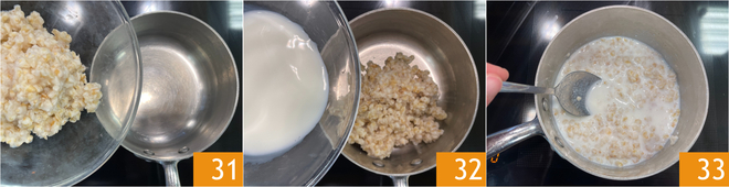 Jetzt die Pastiera-Füllung vorbereiten: In einem Topf den gekochten Weizen 31 und die Milch 32 gießen, dann unter häufigem Rühren fast zum Kochen bringen 33. Wenn die Mischung eingedickt ist, die Hitze abstellen und abkühlen lassen.