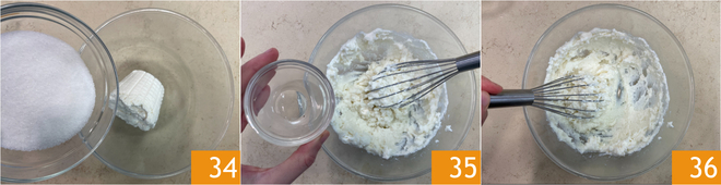 In der Zwischenzeit in einer Schüssel den Ricotta und den Zucker 34 vermengen, das Orangenblütenwasser 35 hinzufügen und gut mit einem Schneebesen vermischen 36.