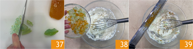 Die kandierten Früchte in kleine Würfel schneiden 37 und zu der Mischung hinzufügen 38, dann mit der geriebenen Orangenschale aromatisieren 39.