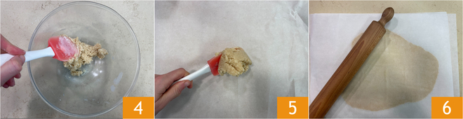 Mit einem Spatel vermengen, bis ein homogener Teig entsteht 4. Den Teig auf ein Backpapier legen 5, mit einem weiteren Papier bedecken und mit einem Nudelholz zu einem etwa 2 mm dicken Blatt ausrollen 6. Das Blatt auf ein Blech mit dem Backpapier legen und im Gefrierschrank etwa 15 Minuten fest werden lassen.