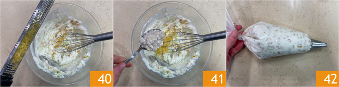Auch die Zitronenschale hinzufügen 40 und schließlich den gekochten und abgekühlten Weizen 41 integrieren. Alles vermischen und nach Geschmack die Intensität des Aromas anpassen. In einen Spritzbeutel mit einer 1 cm glatten Tülle füllen 42.
