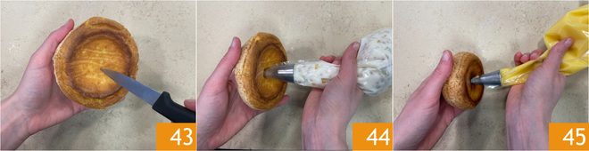 Es ist Zeit, das Dessert zusammenzusetzen: Die größeren Windbeutel nehmen und mit der Spitze eines Messers ein Loch in die Basis stechen 43, dann die Tülle des Spritzbeutels einführen und mit der Pastiera-Füllung füllen 44. Dasselbe mit den kleineren Windbeuteln machen und mit der Lemon-Curd-Füllung füllen 45.
