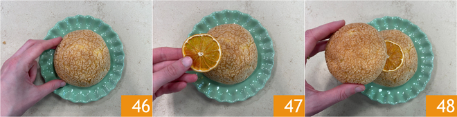 Den Pastiera-Windbeutel auf den Teller legen 46, dann eine Scheibe getrocknete Orange darauf legen 47 und mit dem Lemon-Curd-Windbeutel krönen 48.