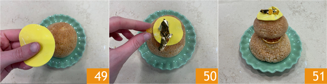 Zum Schluss mit einem dünnen gelben Fondant-Kreis 49, einem Blatt aus essbarem Gold und einem Stück kandierter Orange garnieren 50. Ihr Mon Chou der Pastiera ist bereit, serviert zu werden 51!