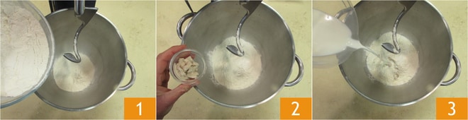 Um die Montanarine mit Burrata und geräuchertem Lachs zuzubereiten, geben Sie das Mehl Type 0 1, die zerkleinerte Hefe 2 und die Milch 3 in die Küchenmaschine. Kneten Sie mit dem Knethaken für 5 Minuten, bis der Teig am Haken haftet.