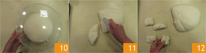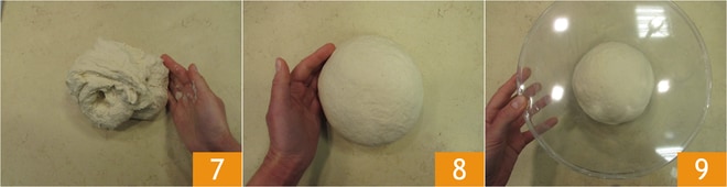 Übertragen Sie den Teig auf die Arbeitsfläche 7, formen Sie ihn zu einer Kugel, indem Sie ihn mit der Handfläche rollen 8, und legen Sie den Teig dann in eine große Schüssel. Decken Sie die Schüssel mit Frischhaltefolie ab 9 und lassen Sie den Teig bei ca. 25° für 2 Stunden gehen, bis sich das Volumen verdoppelt hat.