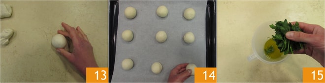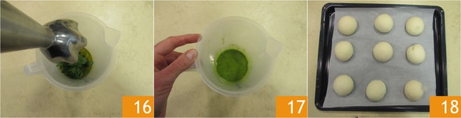Formen Sie die Teigbällchen 13 und legen Sie sie auf ein oder mehrere mit Backpapier ausgelegte Bleche (mindestens 5 cm Abstand zwischen ihnen) 14. Lassen Sie die Montanarine für weitere 30 Minuten an einem zugfreien Ort bei ca. 25° gehen (ggf. mit einer weichen Folie bedecken). In der Zwischenzeit Öl und Petersilie in einen hohen Behälter geben 15.