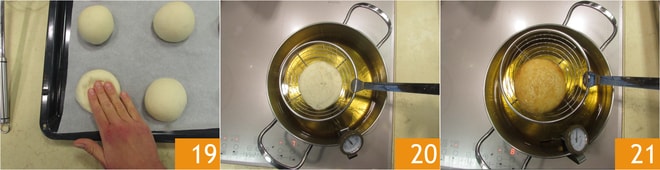 Drücken Sie die Bällchen leicht in der Mitte flach 19. Erhitzen Sie das Pflanzenöl auf eine Temperatur von 165°, dann tauchen Sie die Montanarine ein 20 und braten Sie sie für ca. 3-5 Minuten, bis sie goldbraun sind 21.