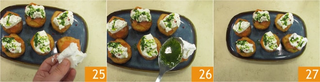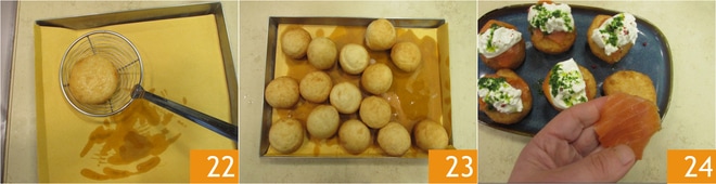 Lassen Sie die Montanarine auf Küchenpapier abtropfen 22, lassen Sie sie leicht abkühlen 23 und garnieren Sie sie mit dem geräucherten Lachs 24.