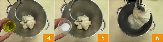 Fügen Sie dem Teig das Öl 4 und das Salz 5 hinzu und kneten Sie erneut für etwa 5-10 Minuten, bis der Teig vollständig elastisch ist und einen glatten, weichen und elastischen Teig 6 ergibt.