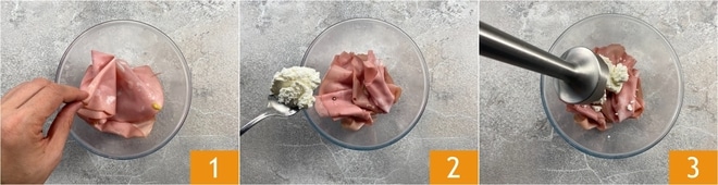 Um die Mortadella-Mousse vorzubereiten, legen Sie die Mortadella-Scheiben in eine Schüssel 1, fügen Sie den Kuhmilch-Ricotta hinzu 2 und pürieren Sie mit dem Stabmixer 3.