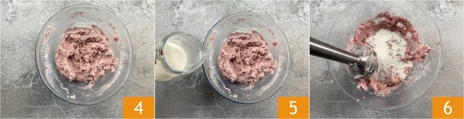 Wenn die Mischung gut vermengt ist 4, gießen Sie die frische flüssige Sahne hinzu 5. Pürieren Sie erneut mit dem Stabmixer 6.