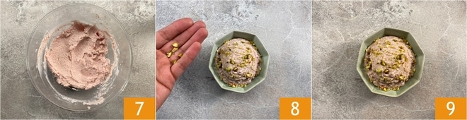 Sie sollten eine glatte und samtige Creme erhalten 7. Übertragen Sie die Mousse in eine kleine Schüssel und garnieren Sie mit gehackten Pistazien 8. Begleiten Sie die Mortadella-Mousse 9 mit geröstetem Brot oder Grissini, oder verwenden Sie sie, um Vol-au-vent zu füllen!