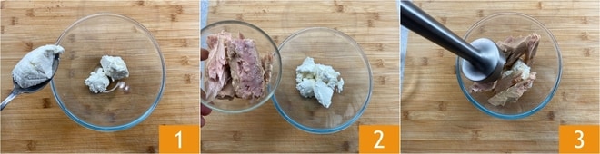 Um die Thunfischmousse zuzubereiten, geben Sie zuerst den Ricotta 1 und die abgetropften Thunfischfilets 2 in eine Schüssel. Pürieren Sie alles mit einem Stabmixer, bis eine Creme entsteht 3.