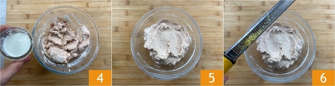 Fügen Sie nun die Sahne hinzu 4 und pürieren Sie weiter, bis Sie eine glatte Konsistenz erreicht haben 5. Fügen Sie die abgeriebene Zitronenschale hinzu 6.