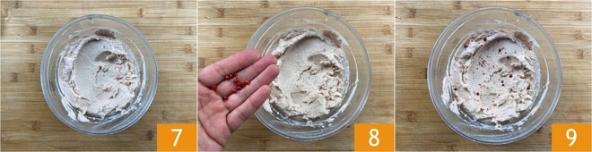 Rühren Sie erneut 7, dann fügen Sie die rosa Pfefferkörner hinzu 8 und rühren Sie ein letztes Mal um 9. Decken Sie die Thunfischmousse mit Frischhaltefolie ab und bewahren Sie sie im Kühlschrank bis zur Verwendung auf.
