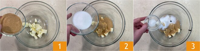 Um die Mousse-Torte aus Bitterschokolade auf Sablé-Boden zuzubereiten, beginnen wir mit dem Boden: In einer Schüssel die gesalzene Butter, den braunen Zucker 1, den Kristallzucker 2, die Vanilleschotenkerne und das Salz 3 geben.