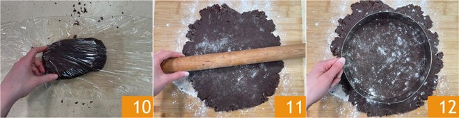Einen Laib formen, in Frischhaltefolie wickeln 10 und für 1 Stunde in den Kühlschrank legen. Den Boden herausnehmen und mit einem Nudelholz auf eine Dicke von 3 mm ausrollen 11, mit einem 22 cm Ring ausstechen 12.