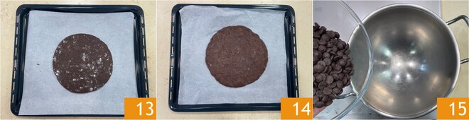 Die Scheibe auf ein mit Backpapier ausgelegtes Backblech legen 13, im vorgeheizten statischen Ofen bei 165° für 20 Minuten backen 14. Die Mousse zubereiten: Die Bitterschokolade im Wasserbad schmelzen 15.